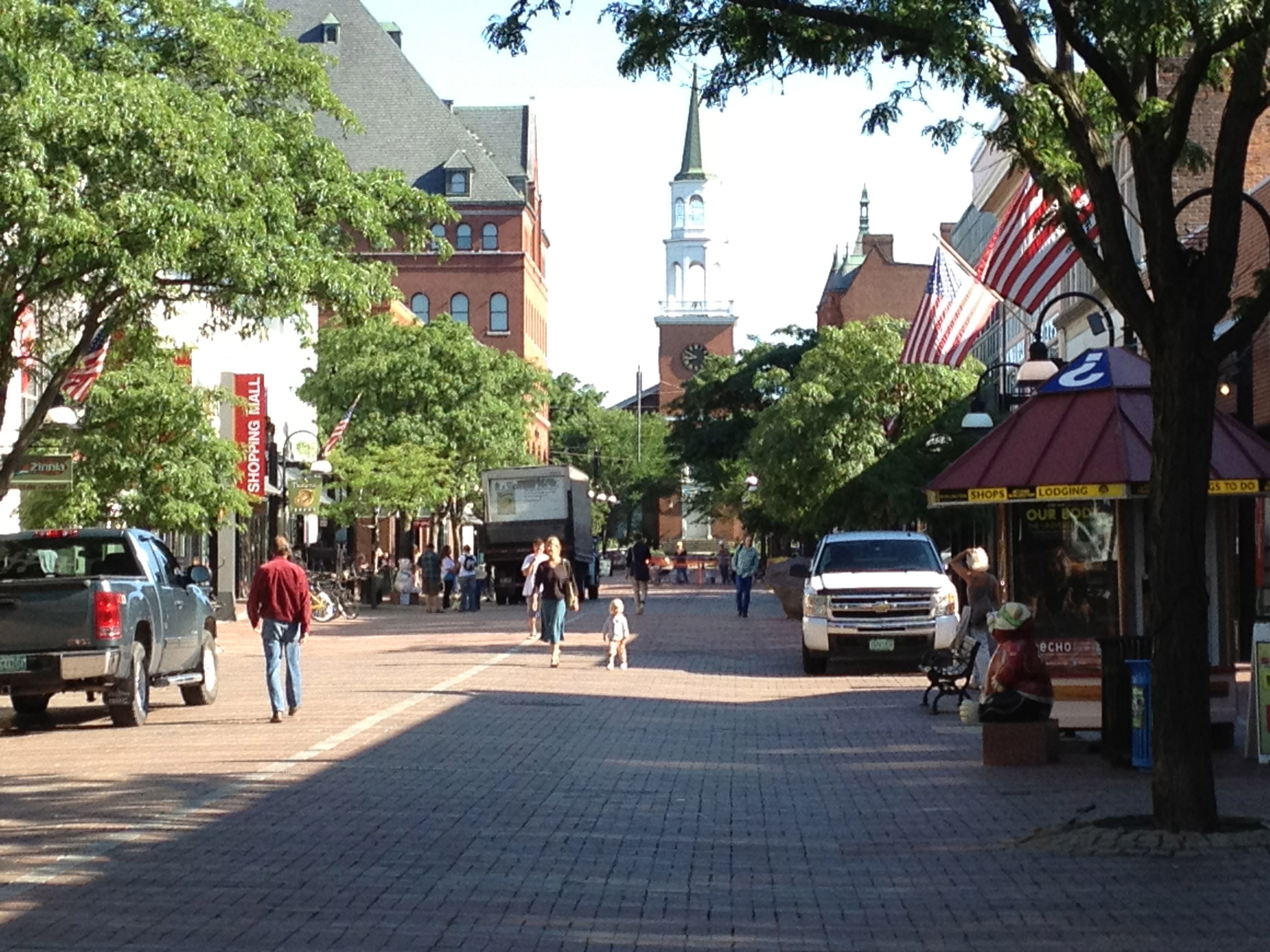 Yesterday I walked down Church Street early. I do not do it often anymore. I had just dropped off my daughter at a photography camp program on lower Church Street (how things loop around) and was walking with my son to have breakfast in town. The scene has not changed much. I still wondered about the people on either side of the deliveries, and the waitresses don’t seem so cute now (compared to my wife, who could?) but the trucks were still lined up and the boxes still rolled off the backs of them.
