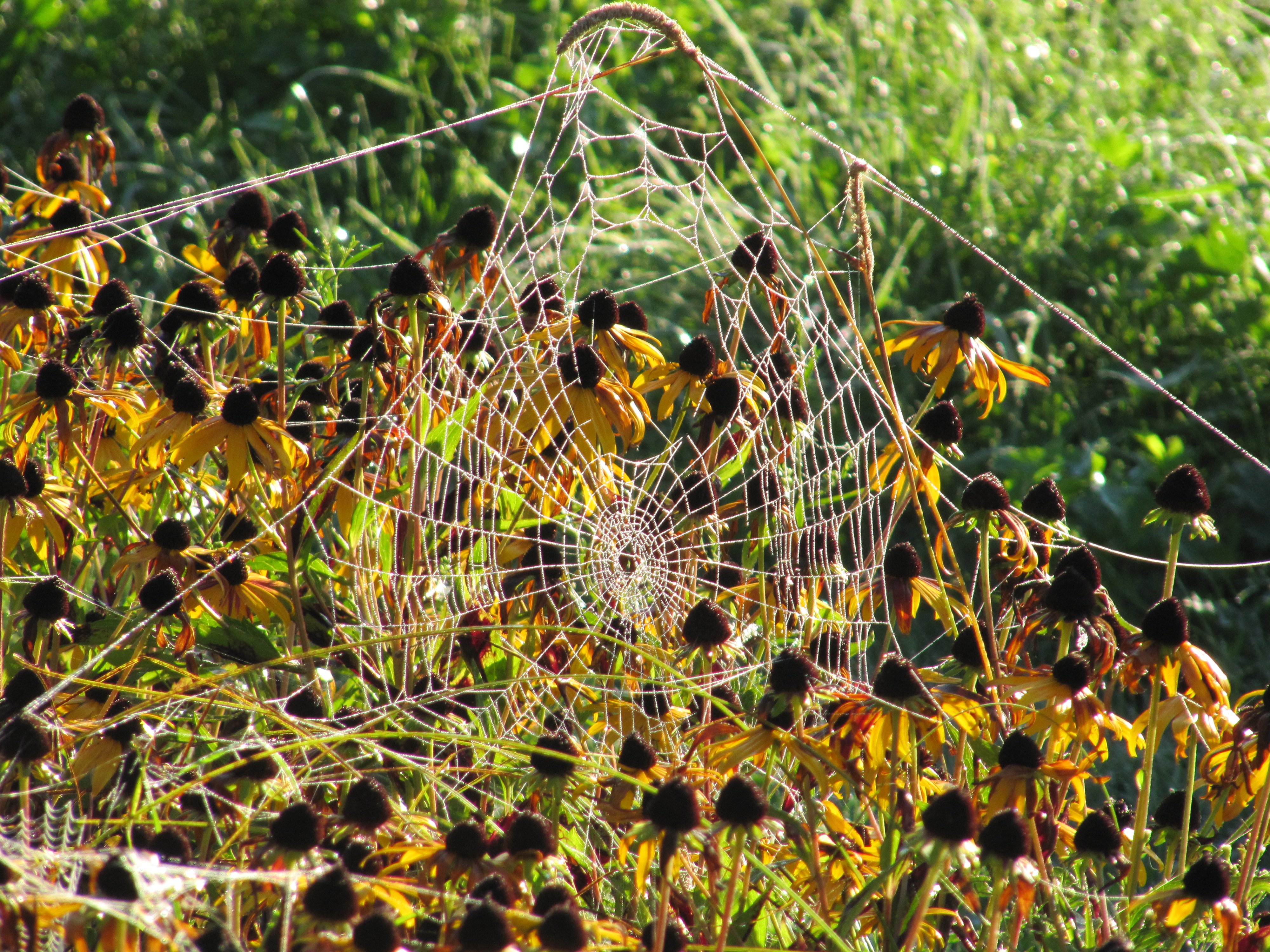 There are hundreds of them, stretched between stalks, glowing in the morning light, their creators waiting for things to dry so they can have breakfast caught the night before, or so they can repair the damage and try again. There are too many to count.