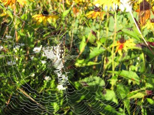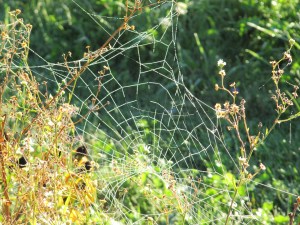 In the morning these days, the sun catches the light across the field. The nights are cool, and that means dew on the leaves. The milkweed and grasses and goldenrod are covered in beads of water.  And if you look when the sun is shining at just the right angle, you see the spider webs. The light only lasts a short time and then they disappear, but if you catch it right you can see them everywhere.