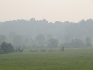 It turns out there are a series of forest fires in Quebec. The northern wind has been blowing the smoke our way. It seemed misty this morning but the sun should have long since burned off that business. What lingers is smoke: