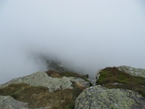 This rain is not unlike the rain I heard on my last night. As I climbed up and over Mount Mansfield (my first time up there in almost 20 years in Vermont), fog blew in. I did not get much of a view. I waited up there for an hour or so, and caught a few glimpses of the scene below, but mostly I saw white.