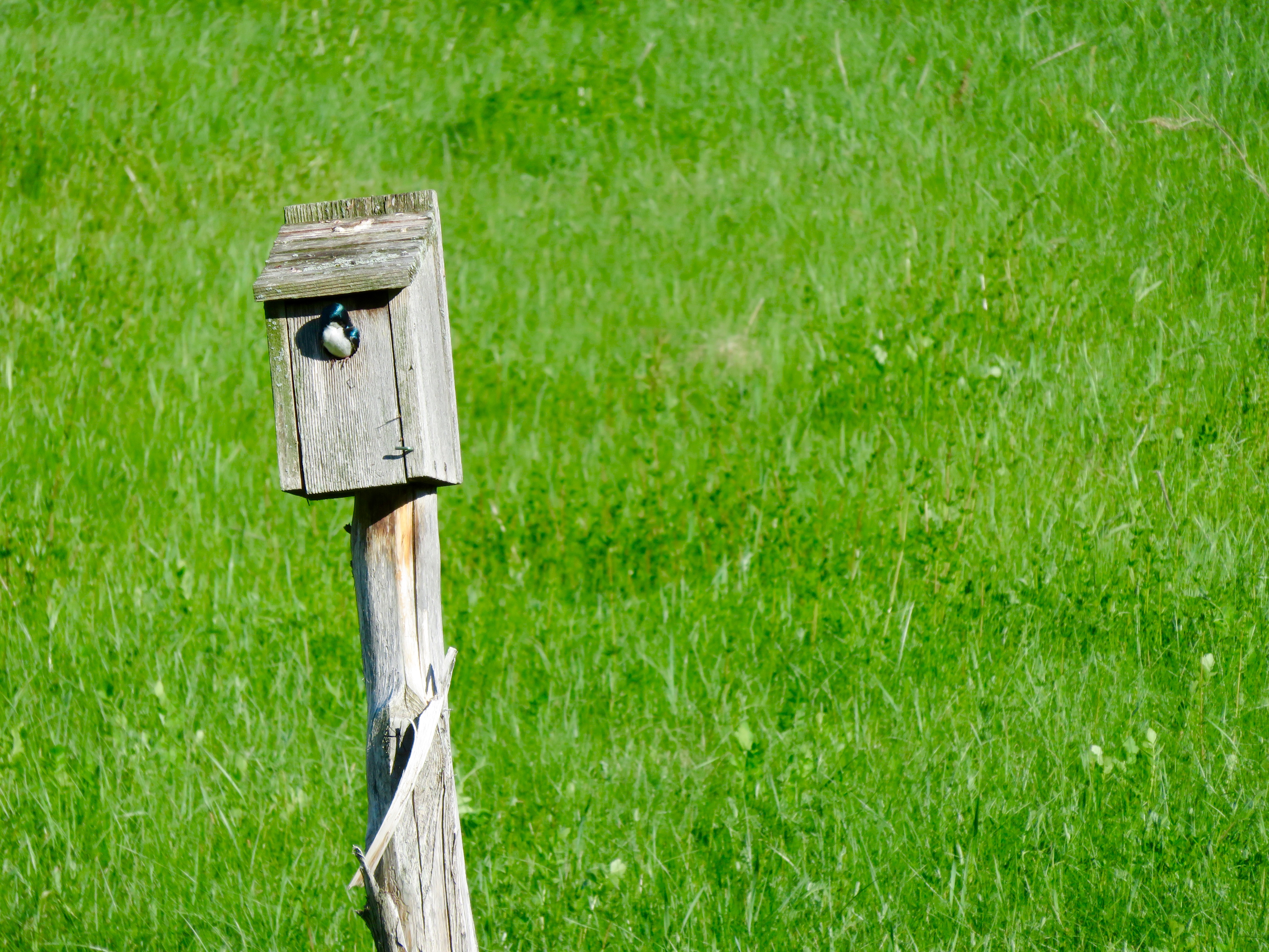 The bluebirds liked the two boxes that are closest to a big maple tree. They like to hop up into the tree and to perch on top of the boxes, back and forth. The swallows prefer the one that is most open, accessible to the open field for their insect foraging. The wrens like to be close to cover, so the nesting box next to the Norway Spruce was just right for them.