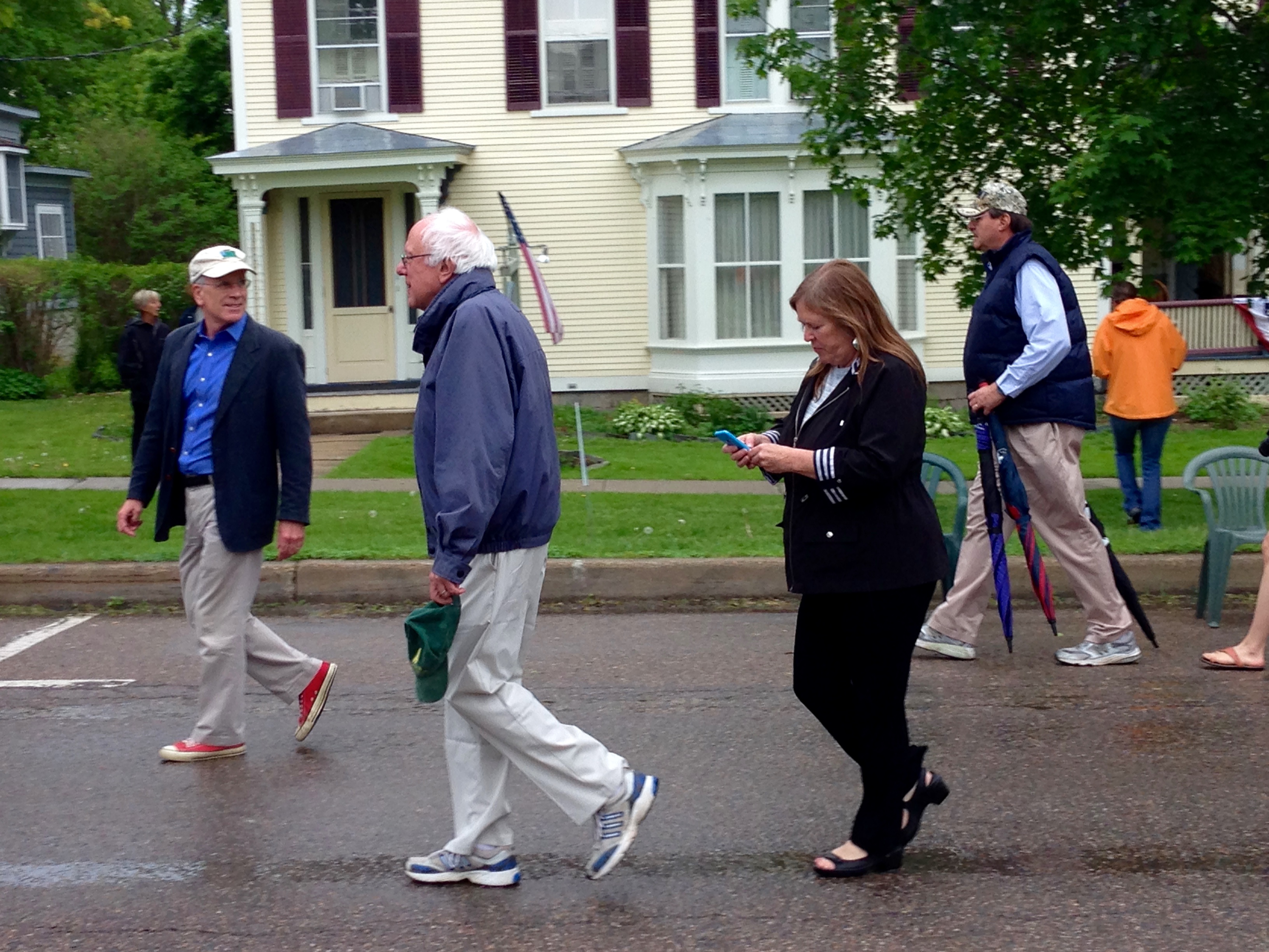 In this photo, his wife, Jane, is walking behind him. I am not sure what she was doing with her phone. Maybe she was tweeting “Mem Day Parade w/Bernie @Berniesanders. Need to remind him to iron pants!” but that is just a guess on my part.